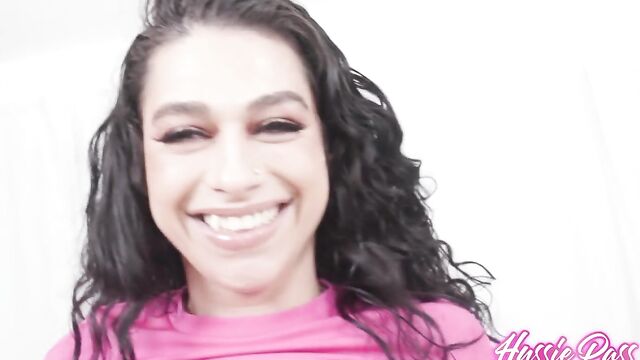 Description: Curvy American-Israeli babe Amirah Sky makes her Hussie Pass debut today, and we paired her up with Damion Dayski and his 12-inch prick for today's interracial update! Director Johnny Robins kicks things off by interviewing the 27-year-old relative newbie, followed by Amirah stripping naked and warming up her kosher pussy, first using her fingers and then with a rather large translucent rubber DONG! Damion makes his way into the scene with some lube for Amirah's Double-D breasts and for her rather juicy backside, which she then twerks for us before showing off how flexible she is by doing a split on the couch. Amirah gets on her knees and begins to suck and slobber on Damion's big cock before they move to the sofa for some more sucking, followed by a nice slick footjob. Damion then sticks his dick in between her rather ample breasts before going down on Amirah to see just how kosher her pussy is. Then he put it in! Amirah takes ALL of Damion missionary, reverse cowgirl, doggystyle, upright, and on her side until he pulls out and cums on her pretty little face. We followed the two of them into the shower afterward for a quick post-sex interview.
